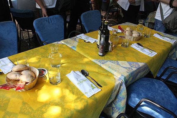 餐廳的桌上是黃色及藍色的塑膠桌步