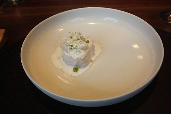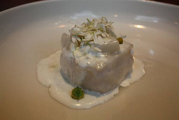 是一坨白色的魚與白色的醬汁在白色的盤子上